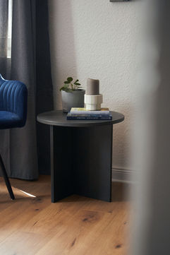 Der Beistelltisch ist aus einer runden Deckplatte und einem in T-Form angeordneten Fuß konstruiert. Dadurch entsteht eine interessante, unsymmetrische Form im Fußbereich. Der Tisch ist vollständig aus Holz materialisiert. Um eine interessante Struktur zu schaffen, wurde durch die Behandlung des Holzes eine marmorierte Oberfläche geschaffen.