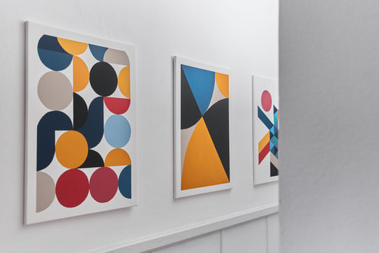 Jedes Bild bildet in sich eine Komposition aus klar abgegrenzten Formen und besticht durch kräftige Farben. Die Abstufungen Blau- und Orangetönen stehen sich komplementär gegenüber und schaffen die farbliche Basis. Die kraftvolle Farbgestaltung wird durch die weiße Rahmung gefasst. Im Ensemble harmonieren die Bilder durch die immer wiederkehrenden Farben und die ähnliche Formsprache. Gerade in schlichten, hellen Räumen können die Bilder den nötigen Farbakzent schaffen. Die Bilder harmonieren nicht nur nebeneinander, sondern können auch Räume miteinander verbinden und als wiederkehrendes Gestaltungselement wirken. Die Komposition der geometrischen Flächen lässt jedem Betrachter selbst Spielraum zur Interpretation.